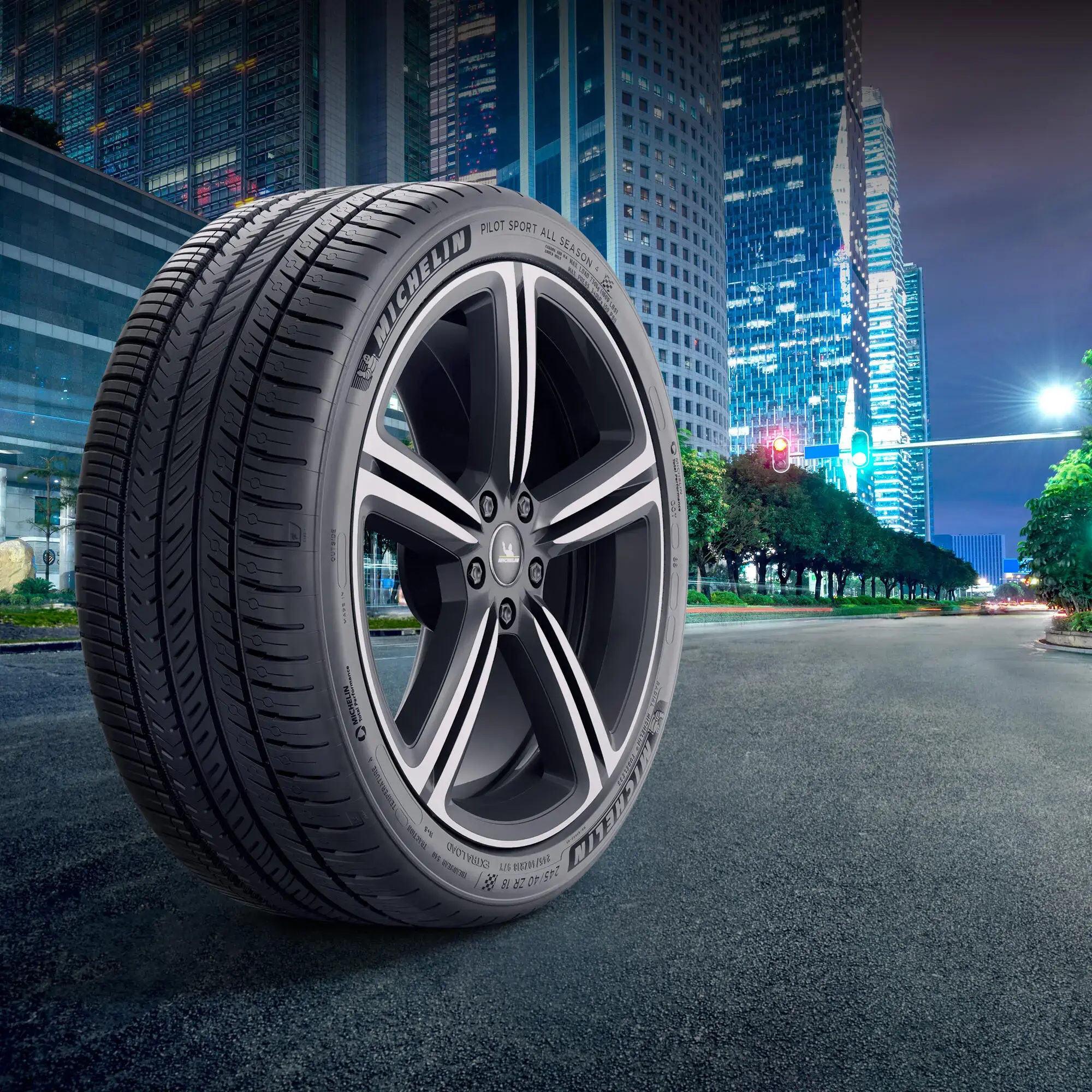 1 - best longevity - Based on an internal treadwear test study conducted in 2019, on public roads versus the Bridgestone® Potenza™ RE980AS Pole Position™ (-29%), Continental® ExtremeContact™ DWS06 (-12%), Pirelli® P ZERO™ ALL SEASON Plus (-25%), and Goodyear® Eagle® Exhilarate™ (-23%) in tire size 245/40ZR18, using 2018 BMW 320i. Actual on-road results may vary.2 - better than predecessor - 4% better dry braking, 5% better wet braking, and 10% more snow traction compared to the MICHELIN® Pilot® Sport A/S 3+. Based on internal studies conducted in 2019, in tire size 245/40ZR18, using a 2015 BMW 328i. Actual on-road results may vary.3 - snow traction vs competitors - Based on third-party snow traction tests done in 2019, upon Michelin's request, using ASTM Test Method F1805-12 in tire size 245/40ZR18 versus the Bridgestone® Potenza™ RE980AS Pole Position™, Continental® ExtremeContact™ DWS06, Pirelli® P ZERO™ ALL SEASON Plus, and Goodyear® Eagle® Exhilarate™. Actual on-road results may vary.